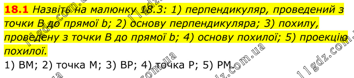 Назвіть на малюнку 18.3: 1) перпендикуляр, проведений з точки B до прямої b; 2) основу перпендикуляра; 3) похилу, проведену з точки B до прямої b; 4) основу похилої; 5) проекцію похилої. 1) BM; 2) точка М; 3) BP; 4) точка Р; 5) PM.