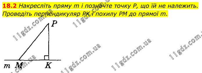 Накресліть пряму m і позначте точку P, що їй не належить. Проведіть перпендикуляр PK і похилу PM до прямої m.