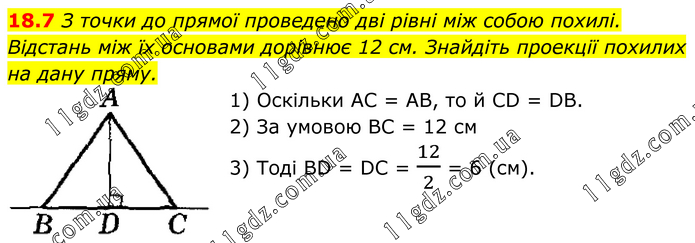 З точки до прямої проведено дві рівні між собою похилі. Відстань між їх основами дорівнює 12 см. Знайдіть проекції похилих на дану пряму. 1) Оскільки AC = AB, то й CD = DB. 2) За умовою BC = 12 см 3) Тоді BD = DC = 12/2 = 6 (см).