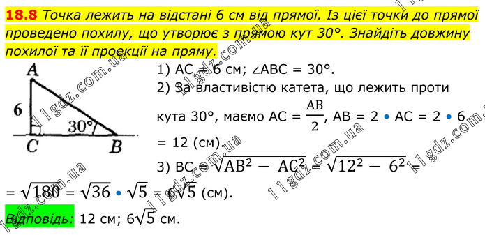 Точка лежить на відстані 6 см від прямої. Із цієї точки до прямої проведено похилу, що утворює з прямою кут 30°. Знайдіть довжину похилої та її проекції на пряму. 1) AC = 6 см; ∠ABC = 30°. 2) За властивістю катета, що лежить проти кута 30°, маємо AC = АВ/2, AB = 2 • AC = 2 • 6 = 12 (см). 3) ВС = √(〖АВ〗^2- 〖АС〗^2 ) = √(12^2- 6^2 ) = = √180 = √36 • √5 = 6√5 (см). Відповідь: 12 см; 6√5 см.
