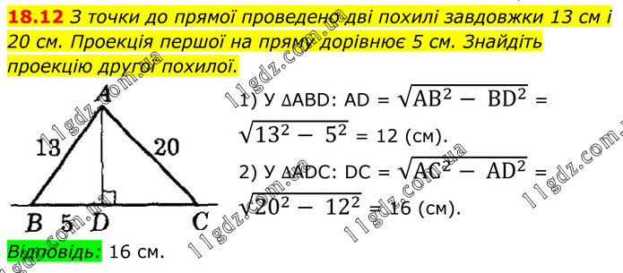 З точки до прямої проведено дві похилі завдовжки 13 см і 20 см. Проекція першої на пряму дорівнює 5 см. Знайдіть проекцію другої похилої. 1) У ∆ABD: AD = √(AB^2- BD^2 ) = √(13^2- 5^2 ) = 12 (см). 2) У ∆ADC: DC = √(AC^2- AD^2 ) = √(20^2- 12^2 ) = 16 (см). Відповідь: 16 см.