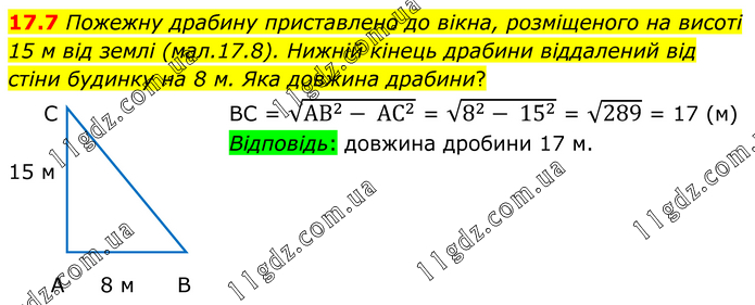 Пожежну драбину приставлено до вікна, розміщеного на висоті 15 м від землі (мал.17.8). Нижній кінець драбини віддалений від стіни будинку на 8 м. Яка довжина драбини? ВС = √(〖АВ〗^2- 〖АС〗^2 ) = √(8^2- 15^2 ) = √289 = 17 (м) Відповідь: довжина дробини 17 м.
