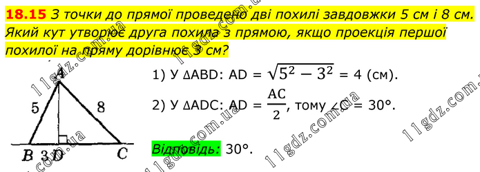 З точки до прямої проведено дві похилі завдовжки 5 см і 8 см. Який кут утворює друга похила з прямою, якщо проекція першої похилої на пряму дорівнює 3 см? 1) У ∆ABD: AD = √(5^2-3^2 ) = 4 (см). 2) У ∆ADC: AD = AC/2, тому ∠С = 30°. Відповідь: 30°.