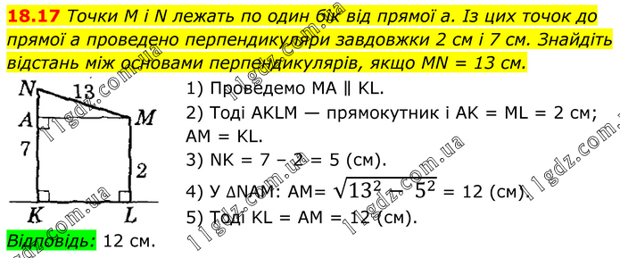 Точки M і N лежать по один бік від прямої а. Із цих точок до прямої а проведено перпендикуляри завдовжки 2 см і 7 см. Знайдіть відстань між основами перпендикулярів, якщо MN = 13 см. 1) Проведемо MA ∥ KL. 2) Тоді AKLM — прямокутник і AK = ML = 2 см; AM = KL. 3) NK = 7 – 2 = 5 (см). 4) У ∆NAM: AM= √(13^2- 5^2 ) = 12 (см). 5) Тоді KL = AM = 12 (см). Відповідь: 12 см.