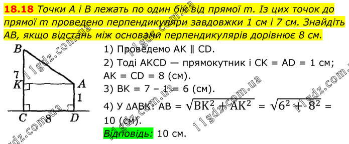 Точки A і B лежать по один бік від прямої m. Із цих точок до прямої m проведено перпендикуляри завдовжки 1 см і 7 см. Знайдіть AB, якщо відстань між основами перпендикулярів дорівнює 8 см. 1) Проведемо AK ∥ CD. 2) Тоді AKCD — прямокутник і CK = AD = 1 см; AK = CD = 8 (см). 3) BK = 7 – 1 = 6 (см). 4) У ∆АВК: AB = √(BK^2+AK^2 ) = √(6^2+ 8^2 ) = 10 (см). Відповідь: 10 см.