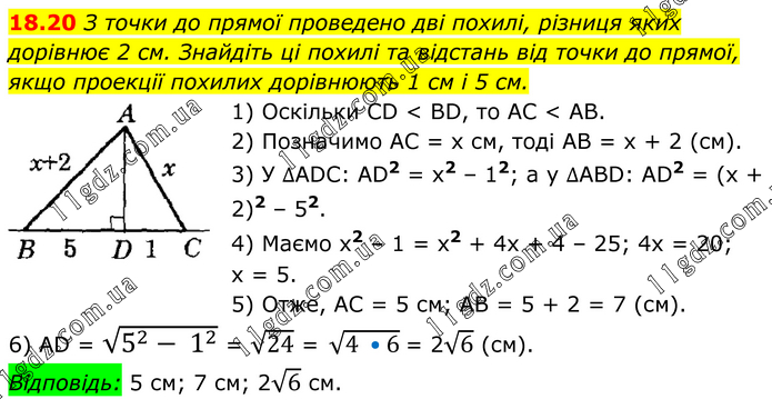 З точки до прямої проведено дві похилі, різниця яких дорівнює 2 см. Знайдіть ці похилі та відстань від точки до прямої, якщо проекції похилих дорівнюють 1 см і 5 см. 1) Оскільки CD < BD, то AC < AB. 2) Позначимо AC = х см, тоді AB = х + 2 (см). 3) У ∆ADC: AD2 = х2 – 12; а у ∆ABD: AD2 = (х + 2)2 – 52. 4) Маємо х2 – 1 = х2 + 4х + 4 – 25; 4х = 20; х = 5. 5) Отже, AC = 5 см; AB = 5 + 2 = 7 (см). 6) AD = √(5^2- 1^2 ) = √24 = √(4 •6) = 2√6 (см). Відповідь: 5 см; 7 см; 2√6 см.