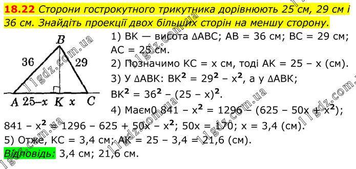 Сторони гострокутного трикутника дорівнюють 25 см, 29 см і 36 см. Знайдіть проекції двох більших сторін на меншу сторону. 1) BK — висота ∆АВС; AB = 36 см; BC = 29 см; AC = 25 см. 2) Позначимо KC = х см, тоді AK = 25 – х (см). 3) У ∆АВК: BK2 = 292 – х2, а у ∆АВК; BK2 = 362 – (25 – х)2. 4) Маєм0 841 – х2 = 1296 – (625 – 50x + х2); 841 – х2 = 1296 – 625 + 50х – х2; 50х = 170; х = 3,4 (см). 5) Отже, KC = 3,4 см; AК = 25 – 3,4 = 21,6 (см). Відповідь: 3,4 см; 21,6 см.