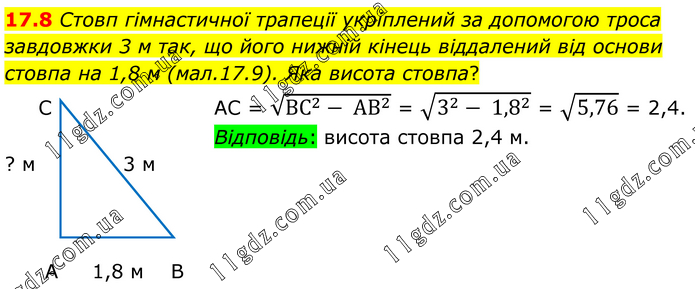 Стовп гімнастичної трапеції укріплений за допомогою троса завдовжки 3 м так, що його нижній кінець віддалений від основи стовпа на 1,8 м (мал.17.9). Яка висота стовпа? АС = √(〖ВС〗^2- 〖АВ〗^2 ) = √(3^2- 〖1,8〗^2 ) = √5,76 = 2,4. Відповідь: висота стовпа 2,4 м.