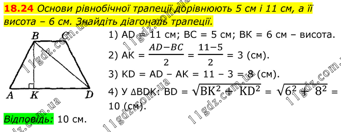 Основи рівнобічної трапеції дорівнюють 5 см і 11 см, а її висота – 6 см. Знайдіть діагональ трапеції. 1) AD = 11 см; ВС = 5 см; ВК = 6 см – висота. 2) АК = (AD-BC)/2 = (11-5)/2 = 3 (см). 3) KD = AD – AK = 11 – 3 = 8 (см). 4) У ∆BDK: BD = √(BK^2+ KD^2 ) = √(6^2+ 8^2 ) = 10 (см). Відповідь: 10 см.