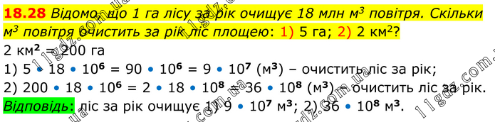 Відомо, що 1 га лісу за рік очищує 18 млн м3 повітря. Скільки м3 повітря очистить за рік ліс площею: 1) 5 га; 2) 2 км2? 2 км2 = 200 га 1) 5 • 18 • 106 = 90 • 106 = 9 • 107 (м3) – очистить ліс за рік; 2) 200 • 18 • 106 = 2 • 18 • 108 = 36 • 108 (м3) – очистить ліс за рік. Відповідь: ліс за рік очищує 1) 9 • 107 м3; 2) 36 • 108 м3.