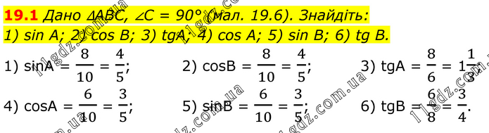 Дано ∆ABC, ∠C = 90° (мал. 19.6). Знайдіть: 1) sin A; 2) cos B; 3) tgA; 4) cos A; 5) sin B; 6) tg B. 1) sinA = 8/10 = 4/5; 2) cosB = 8/10 = 4/5; 3) tgA = 8/6 = 11/3; 4) cosA = 6/10 = 3/5; 5) sinB = 6/10 = 3/5; 6) tgB = 6/8 = 3/4.