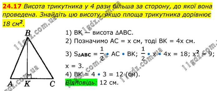 Висота трикутника у 4 рази більша за сторону, до якої вона проведена. Знайдіть цю висоту, якщо площа трикутника дорівнює 18 см2. 1) BK — висота ∆АВС. 2) Позначимо AC = х см, тоді BK = 4х см. 3) S∆ABC = 1/2 • AC • BK; 1/2 • х • 4x = 18; x2 = 9; х = 3. 4) BK = 4 • 3 = 12 (см). Відповідь: 12 см.