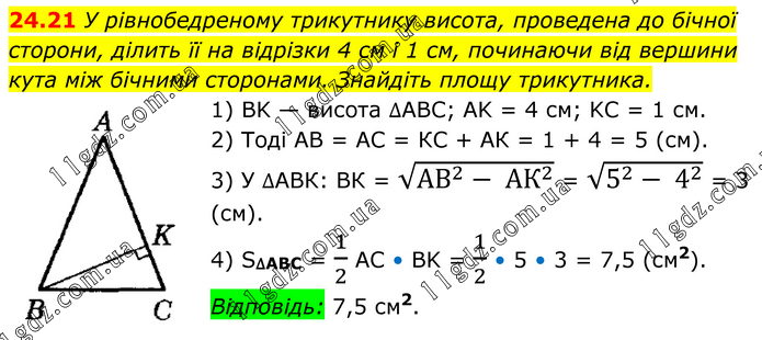 У рівнобедреному трикутнику висота, проведена до бічної сторони, ділить її на відрізки 4 см і 1 см, починаючи від вершини кута між бічними сторонами. Знайдіть площу трикутника. 1) BK — висота ∆АВС; AK = 4 см; KC = 1 см. 2) Тоді АВ = АС = КС + АК = 1 + 4 = 5 (см). 3) У ∆АВК: ВК = √(〖АВ〗^2- 〖АК〗^2 ) = √(5^2- 4^2 ) = 3 (см). 4) S∆ABC = 1/2 AC • BK = 1/2 • 5 • 3 = 7,5 (см2). Відповідь: 7,5 см2.