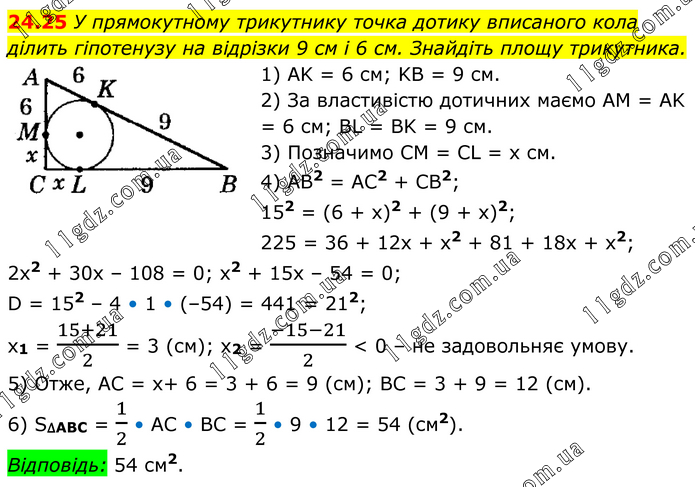 У прямокутному трикутнику точка дотику вписаного кола ділить гіпотенузу на відрізки 9 см і 6 см. Знайдіть площу трикутника. 1) AK = 6 см; KB = 9 см. 2) За властивістю дотичних маємо AM = AK = 6 см; BL = BK = 9 см. 3) Позначимо CM = CL = х см. 4) AB2 = AC2 + CB2; 152 = (6 + х)2 + (9 + х)2; 225 = 36 + 12х + х2 + 81 + 18х + х2; 2x2 + 30x – 108 = 0; x2 + 15х – 54 = 0; D = 152 – 4 • 1 • (–54) = 441 = 212; x1 = (15+21)/2 = 3 (см); x2 = (-15-21)/2 < 0 – не задовольняє умову. 5) Отже, AC = х+ 6 = 3 + 6 = 9 (см); BC = 3 + 9 = 12 (см). 6) S∆ABC = 1/2 • АС • ВС = 1/2 • 9 • 12 = 54 (см2). Відповідь: 54 см2.
