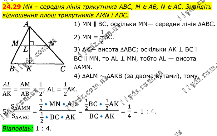 MN – середня лінія трикутника ABC, M ∈ AB, N ∈ AC. Знайдіть відношення площ трикутників AMN і ABC. 1) MN ∥ BC, оскільки MN— середня лінія ∆АВС. 2) MN = 1/2BC. 3) AK— висота ∆ABC; оскільки AK ⊥ BC і BC ∥ MN, то AL ⊥ MN, тобто AL — висота ∆AMN. 4) ∆ALM ~ ∆AKB (за двома кутами), тому AL/AK = AM/AB = 1/2; AL = 1/2AK. 5) S_∆AMN/S_∆ABC = (1/2 • MN • AL)/(1/2 • BC • AK) = (1/2 BC • 1/2 AK)/(BC • AK) = 1/4 = 1 : 4. Відповідь: 1 : 4.
