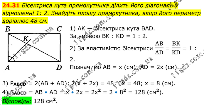 Бісектриса кута прямокутника ділить його діагональ у відношенні 1: 2. Знайдіть площу прямокутника, якщо його периметр дорівнює 48 см. 1) AK — бісектриса кута BAD. За умовою BK : KD = 1 : 2. 2) За властивістю бісектриси AB/AD = BK/KD = 1 : 2. Позначимо AB = х (см); AD = 2х (см). 3) PABCD = 2(АВ + AD); 2(x + 2х) = 48; 6х = 48; x = 8 (см). 4) SABCD = AB • AD = х • 2х = 2x2 = 2 • 82 = 128 (см2). Відповідь: 128 см2.