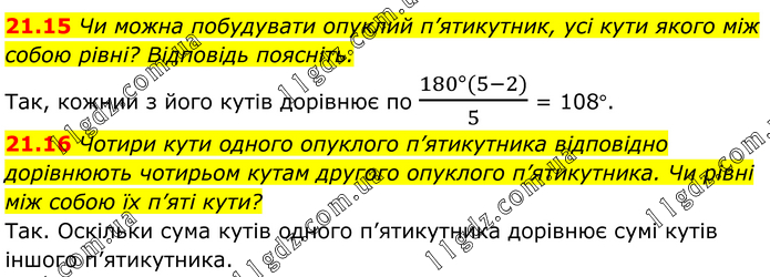 21.15 Чи можна побудувати опуклий п’ятикутник, усі кути якого між собою рівні? Відповідь поясніть. Так, кожнии з його кутів дорівнює по (180°(5-2))/5 = 108°. 21.16 Чотири кути одного опуклого п’ятикутника відповідно дорівнюють чотирьом кутам другого опуклого п’ятикутника. Чи рівні між собою їх п’яті кути? Так. Оскільки сума кутів одного п’ятикутника дорівнює сумі кутів іншого п’ятикутника.