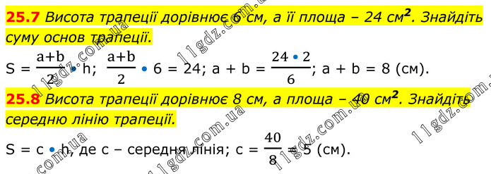 25.7 Висота трапеції дорівнює 6 см, а її площа – 24 см2. Знайдіть суму основ трапеції. S = (a+b)/2 • h; (a+b)/2 • 6 = 24; a + b = (24 • 2)/6; a + b = 8 (см). 25.8 Висота трапеції дорівнює 8 см, а площа – 40 см2. Знайдіть середню лінію трапеції. S = c • h, де с – середня лінія; с = 40/8 = 5 (см).