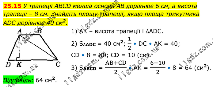 У трапеції ABCD менша основа AB дорівнює 6 см, а висота трапеції – 8 см. Знайдіть площу трапеції, якщо площа трикутника ADC дорівнює 40 см2. 1) АК – висота трапеції і ∆ADC. 2) S∆ADC = 40 см2; 1/2 • DC • AK = 40; CD • 8 = 80; CD = 10 (см). 3) SABCD = (AB+CD)/2 • AK = (6+10)/2 • 8 = 64 (см2). Відповідь: 64 см2.