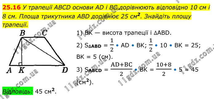 У трапеції ABCD основи AD і BC дорівнюють відповідно 10 см і 8 см. Площа трикутника ABD дорівнює 25 см2. Знайдіть площу трапеції. 1) BК — висота трапеції і ∆ABD. 2) S∆ABD = 1/2 • AD • BK; 1/2 • 10 • BK = 25; BK = 5 (см). 3) SABCD = (AD+BC)/2 • BK = (10+8)/2 • 5 = 45 (см2). Відповідь: 45 см2.