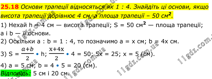 Основи трапеції відносяться як 1 : 4. Знайдіть ці основи, якщо висота трапеції дорівнює 4 см, а площа трапеції – 50 см2. 1) Нехай h = 4 см — висота трапеції; S = 50 см2 — площа трапеції; а і b — її основи. 2) Оскільки а : b = 1 : 4, то позначимо а = х см; b = 4х см. 3) S = (a+b)/2 • h; (x+4x)/2 • 4 = 50; 5х = 25; х = 5 (см). 4) а = 5 cм; b = 4 • 5 = 20 (см). Відповідь: 5 см і 20 см.