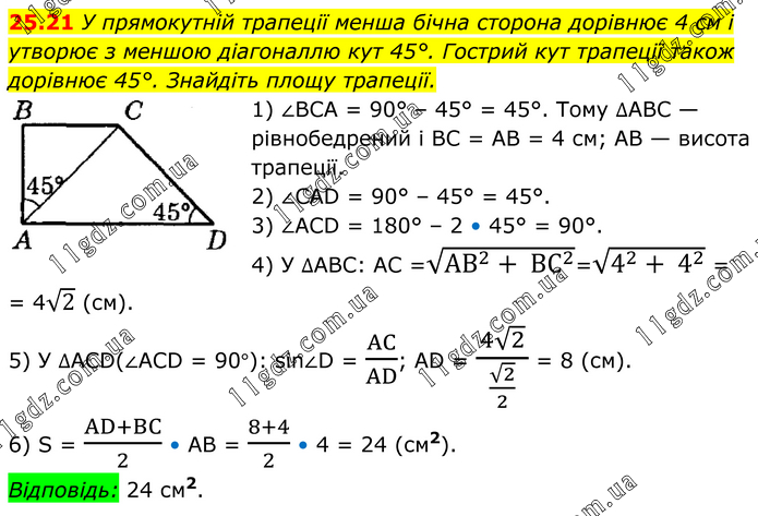 У прямокутній трапеції менша бічна сторона дорівнює 4 см і утворює з меншою діагоналлю кут 45°. Гострий кут трапеції також дорівнює 45°. Знайдіть площу трапеції. 1) ∠BCA = 90° – 45° = 45°. Тому ∆АВС — рівнобедрений і BC = AB = 4 см; AB — висота трапеції. 2) ∠CAD = 90° – 45° = 45°. 3) ∠ACD = 180° – 2 • 45° = 90°. 4) У ∆ABC: AC =√(〖АВ〗^2+ 〖ВС〗^2 )=√(4^2+ 4^2 ) = = 4√2 (см). 5) У ∆ACD(∠ACD = 90°): sin∠D = AC/AD; AD = (4√2)/(√2/2) = 8 (см). 6) S = (AD+BC)/2 • AB = (8+4)/2 • 4 = 24 (см2). Відповідь: 24 см2.