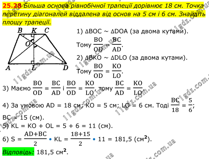 Більша основа рівнобічної трапеції дорівнює 18 см. Точка перетину діагоналей віддалена від основ на 5 см і 6 см. Знайдіть площу трапеції. 1) ∆BOC ~ ∆DOA (за двома кутами). Тому BO/OD = BC/AD. 2) ∆BKO ~ ∆DLO (за двома кутами). Тому BO/OD = KO/LO. 3) Маємо BO/OD = BC/AD і BO/OD = KO/LO, тому BC/AD = KO/LO. 4) За умовою AD = 18 см; КО = 5 см; LO = 6 см. Тоді BC/18 = 5/6; BC = 15 (см). 5) KL = KO + OL = 5 + 6 = 11 (см). 6) S = (AD+BC)/2 • KL = (18+15)/2 • 11 = 181,5 (см2). Відповідь: 181,5 см2.