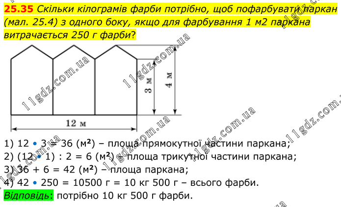 Скільки кілограмів фарби потрібно, щоб пофарбувати паркан (мал. 25.4) з одного боку, якщо для фарбування 1 м2 паркана витрачається 250 г фарби? 1) 12 • 3 = 36 (м2) – площа прямокутної частини паркана; 2) (12 • 1) : 2 = 6 (м2) – площа трикутної частини паркана; 3) 36 + 6 = 42 (м2) – площа паркана; 4) 42 • 250 = 10500 г = 10 кг 500 г – всього фарби. Відповідь: потрібно 10 кг 500 г фарби.