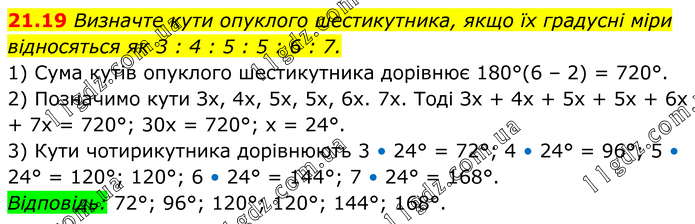 Визначте кути опуклого шестикутника, якщо їх градусні міри відносяться як 3 : 4 : 5 : 5 : 6 : 7. 1) Сума кутів опуклого шестикутника дорівнює 180°(6 – 2) = 720°. 2) Позначимо кути Зх, 4х, 5х, 5х, 6х. 7х. Тоді Зх + 4х + 5х + 5х + 6х + 7х = 720°; 30х = 720°; х = 24°. 3) Кути чотирикутника дорівнюють 3 • 24° = 72°; 4 • 24° = 96°; 5 • 24° = 120°; 120°; 6 • 24° = 144°; 7 • 24° = 168°. Відповідь: 72°; 96°; 120°; 120°; 144°; 168°.