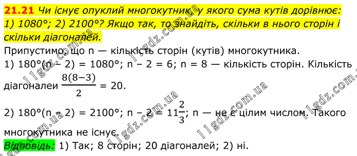 Чи існує опуклий многокутник, у якого сума кутів дорівнює: 1) 1080°; 2) 2100°? Якщо так, то знайдіть, скільки в нього сторін і скільки діагоналей. Припустимо, що n — кількість сторін (кутів) многокутника. 1) 180°(n – 2) = 1080°; n – 2 = 6; n = 8 — кількість сторін. Кількість діагоналеи (8(8-3))/2 = 20. 2) 180°(n – 2) = 2100°; n – 2 = 112/3; n — не є цілим числом. Такого многокутника не існує. Відповідь: 1) Так; 8 сторін; 20 діагоналей; 2) ні.