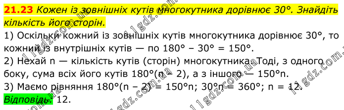 Кожен із зовнішніх кутів многокутника дорівнює 30°. Знайдіть кількість його сторін. 1) Оскільки кожний із зовнішніх кутів многокутника дорівнює 30°, то кожний із внутрішніх кутів — по 180° – 30° = 150°. 2) Нехай n — кількість кутів (сторін) многокутника. Тоді, з одного боку, сума всіх його кутів 180°(n – 2), а з іншого — 150°n. 3) Маємо рівняння 180°(n – 2) = 150°n; 30°n = 360°; n = 12. Відповідь: 12.