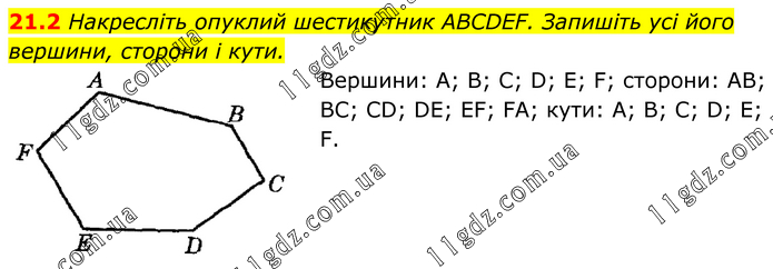 Накресліть опуклий шестикутник ABCDEF. Запишіть усі його вершини, сторони і кути. Вершини: А; В; С; D; Е; F; сторони: AB; BC; CD; DE; EF; FA; кути: А; В; С; D; Е; F.
