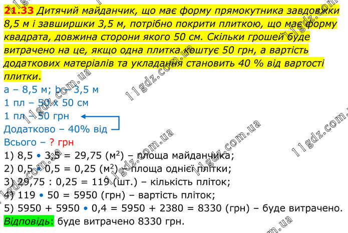 Дитячий майданчик, що має форму прямокутника завдовжки 8,5 м і завширшки 3,5 м, потрібно покрити плиткою, що має форму квадрата, довжина сторони якого 50 см. Скільки грошей буде витрачено на це, якщо одна плитка коштує 50 грн, а вартість додаткових матеріалів та укладання становить 40 % від вартості плитки. 1) 8,5 • 3,5 = 29,75 (м2) – площа майданчика; 2) 0,5 • 0,5 = 0,25 (м2) – площа однієї плітки; 3) 29,75 : 0,25 = 119 (шт.) – кількість пліток; 4) 119 • 50 = 5950 (грн) – вартість пліток; 5) 5950 + 5950 • 0,4 = 5950 + 2380 = 8330 (грн) – буде витрачено. Відповідь: буде витрачено 8330 грн.