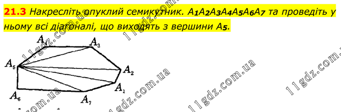 Накресліть опуклий семикутник. A1A2A3A4A5A6A7 та проведіть у ньому всі діагоналі, що виходять з вершини A5.