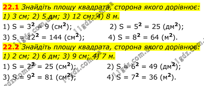 22.1 Знайдіть площу квадрата, сторона якого дорівнює: 1) 3 см; 2) 5 дм; 3) 12 см; 4) 8 м. 1) S = 32 = 9 (см2); 2) S = 52 = 25 (дм2); 3) S = 122 = 144 (см2); 4) S = 82 = 64 (м2). 22.2 Знайдіть площу квадрата, сторона якого дорівнює: 1) 2 см; 2) 6 дм; 3) 9 см; 4) 7 м. 1) S = 22 = 25 (см2); 2) S = 62 = 49 (дм2); 3) S = 92 = 81 (см2); 4) S = 72 = 36 (м2).