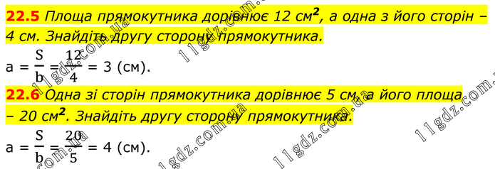 22.5 Площа прямокутника дорівнює 12 см2, а одна з його сторін – 4 см. Знайдіть другу сторону прямокутника. a = S/b = 12/4 = 3 (см). 22.6 Одна зі сторін прямокутника дорівнює 5 см, а його площа – 20 см2. Знайдіть другу сторону прямокутника. a = S/b = 20/5 = 4 (cм).