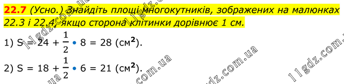 Знайдіть площі многокутників, зображених на малюнках 22.3 і 22.4, якщо сторона клітинки дорівнює 1 см. 1) S = 24 + 1/2 • 8 = 28 (см2). 2) S = 18 + 1/2 • 6 = 21 (см2).