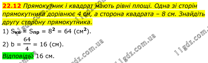 Прямокутник і квадрат мають рівні площі. Одна зі сторін прямокутника дорівнює 4 см, а сторона квадрата – 8 см. Знайдіть другу сторону прямокутника. 1) Sкв = Sпр = 82 = 64 (см2). 2) b = 64/4 = 16 (см). Відповідь: 16 см.
