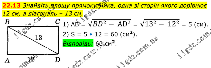Знайдіть площу прямокутника, одна зі сторін якого дорівнює 12 см, а діагональ – 13 см. 1) AB = √(〖BD〗^2- AD^2 ) = √(13^2- 12^2 ) = 5 (см). 2) S = 5 • 12 = 60 (см2). Відповідь: 60 см2.