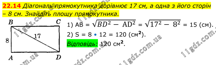 Діагональ прямокутника дорівнює 17 см, а одна з його сторін – 8 см. Знайдіть площу прямокутника. 1) AB = √(〖BD〗^2- AD^2 ) = √(17^2- 8^2 ) = 15 (см). 2) S = 8 • 12 = 120 (см2). Відповідь: 120 см2.