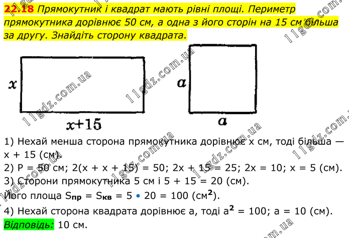 Прямокутник і квадрат мають рівні площі. Периметр прямокутника дорівнює 50 см, а одна з його сторін на 15 см більша за другу. Знайдіть сторону квадрата. 1) Нехай менша сторона прямокутника дорівнює х см, тоді більша — х + 15 (см). 2) P = 50 см; 2(х + х + 15) = 50; 2х + 15 = 25; 2х = 10; х = 5 (см). 3) Сторони прямокутника 5 см і 5 + 15 = 20 (см). Його площа Sпp = Sкв = 5 • 20 = 100 (см2). 4) Нехай сторона квадрата дорівнює а, тоді а2 = 100; а = 10 (см). Відповідь: 10 см.