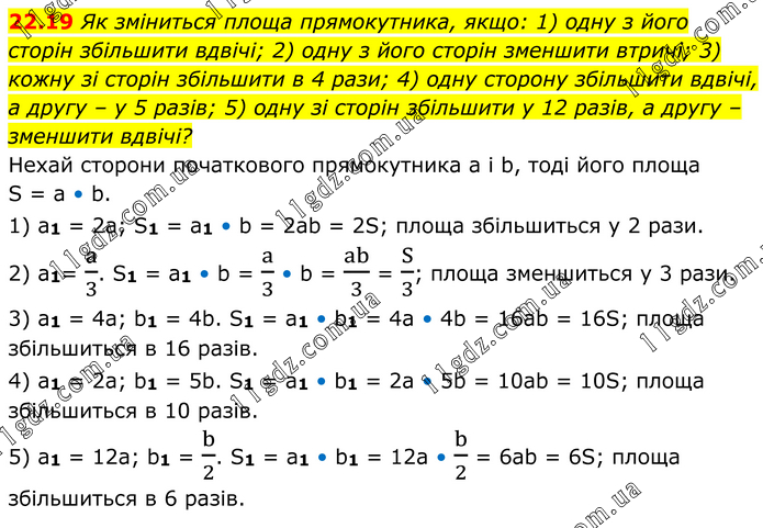 Як зміниться площа прямокутника, якщо: 1) одну з його сторін збільшити вдвічі; 2) одну з його сторін зменшити втричі; 3) кожну зі сторін збільшити в 4 рази; 4) одну сторону збільшити вдвічі, а другу – у 5 разів; 5) одну зі сторін збільшити у 12 разів, а другу – зменшити вдвічі? Нехай сторони початкового прямокутника а і b, тоді його площа S = а • b. 1) a1 = 2а; S1 = a1 • b = 2ab = 2S; площа збільшиться у 2 рази. 2) a1= a/3. S1 = a1 • b = a/3 • b = ab/3 = S/3; площа зменшиться у 3 рази. 3) a1 = 4а; b1 = 4b. S1 = a1 • b1 = 4а • 4b = 16аb = 16S; площа збільшиться в 16 разів. 4) a1 = 2а; b1 = 5b. S1 = a1 • b1 = 2а • 5b = 10аb = 10S; площа збільшиться в 10 разів. 5) а1 = 12а; b1 = b/2. S1 = a1 • b1 = 12a • b/2 = 6ab = 6S; площа збільшиться в 6 разів.