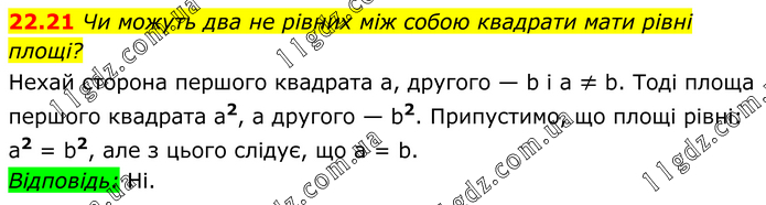 Чи можуть два не рівних між собою квадрати мати рівні площі? Нехай сторона першого квадрата а, другого — b і а ≠ b. Тоді площа першого квадрата a2, а другого — b2. Припустимо, що площі рівні: а2 = b2, але з цього слідує, що а = b. Відповідь: Ні.