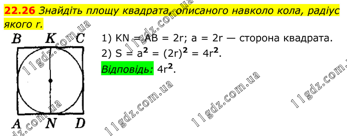 Знайдіть площу квадрата, описаного навколо кола, радіус якого r. 1) KN = AB = 2r; а = 2r — сторона квадрата. 2) S = а2 = (2r)2 = 4r2. Відповідь: 4r2.