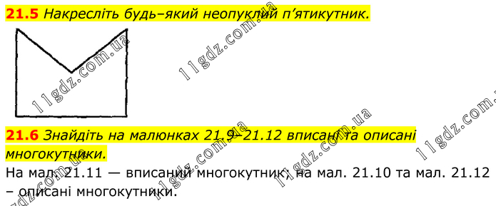 21.5 Накресліть будь–який неопуклий п’ятикутник. 21.6 Знайдіть на малюнках 21.9–21.12 вписані та описані многокутники. На мал. 21.11 — вписаний многокутник; на мал. 21.10 та мал. 21.12 – описані многокутники.