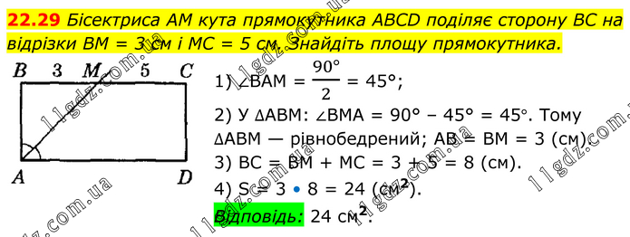 Бісектриса AM кута прямокутника ABCD поділяє сторону BC на відрізки BM = 3 см і MC = 5 см. Знайдіть площу прямокутника. 1) ∠BAM = (90°)/2 = 45°; 2) У ∆ABM: ∠BMA = 90° – 45° = 45°. Тому ∆ABM — рівнобедрений; AB = BM = 3 (см). 3) BC = BM + MC = 3 + 5 = 8 (см). 4) S = 3 • 8 = 24 (см2). Відповідь: 24 см2.