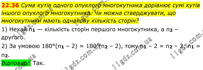 Сума кутів одного опуклого многокутника дорівнює сумі кутів іншого опуклого многокутника. Чи можна стверджувати, що многокутники мають однакову кількість сторін? 1) Нехай n1 — кількість сторін першого многокутника, а n2 – другого. 2) За умовою 180°(n1 – 2) = 180°(n2 – 2), тому n1 – 2 = n2 – 2; n1 = n2. Відповідь: Так.
