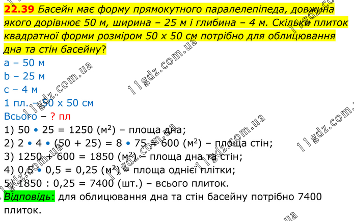 Басейн має форму прямокутного паралелепіпеда, довжина якого дорівнює 50 м, ширина – 25 м і глибина – 4 м. Скільки плиток квадратної форми розміром 50 х 50 см потрібно для облицювання дна та стін басейну? a – 50 м b – 25 м c – 4 м 1 пл. – 50 х 50 см Всього – ? пл 1) 50 • 25 = 1250 (м2) – площа дна; 2) 2 • 4 • (50 + 25) = 8 • 75 = 600 (м2) – площа стін; 3) 1250 + 600 = 1850 (м2) – площа дна та стін; 4) 0,5 • 0,5 = 0,25 (м2) – площа однієї плітки; 5) 1850 : 0,25 = 7400 (шт.) – всього плиток. Відповідь: для облицювання дна та стін басейну потрібно 7400