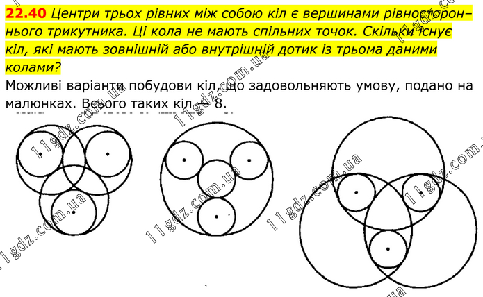 Центри трьох рівних між собою кіл є вершинами рівносторон–нього трикутника. Ці кола не мають спільних точок. Скільки існує кіл, які мають зовнішній або внутрішній дотик із трьома даними колами? Можливі варіанти побудови кіл, що задовольняють умову, подано на малюнках. Всього таких кіл — 8.