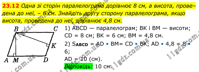 Одна зі сторін паралелограма дорівнює 8 см, а висота, прове– дена до неї, – 6 см. Знайдіть другу сторону паралелограма, якщо висота, проведена до неї, дорівнює 4,8 см. 1) ABCD — паралелограм; BK і BM — висоти; CD = 8 см; BK = 6 см; BM = 4,8 см. 2) SABCD = AD • BM= CD • BK; AD • 4,8 = 8 • 6; AD = 10 (см). Відповідь: 10 см.